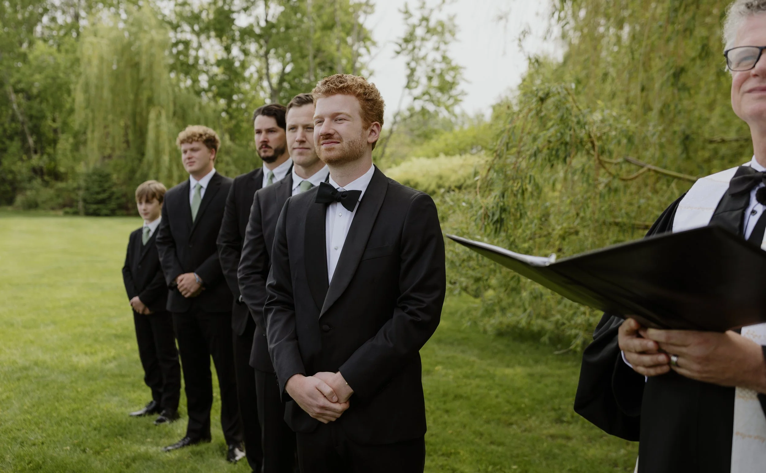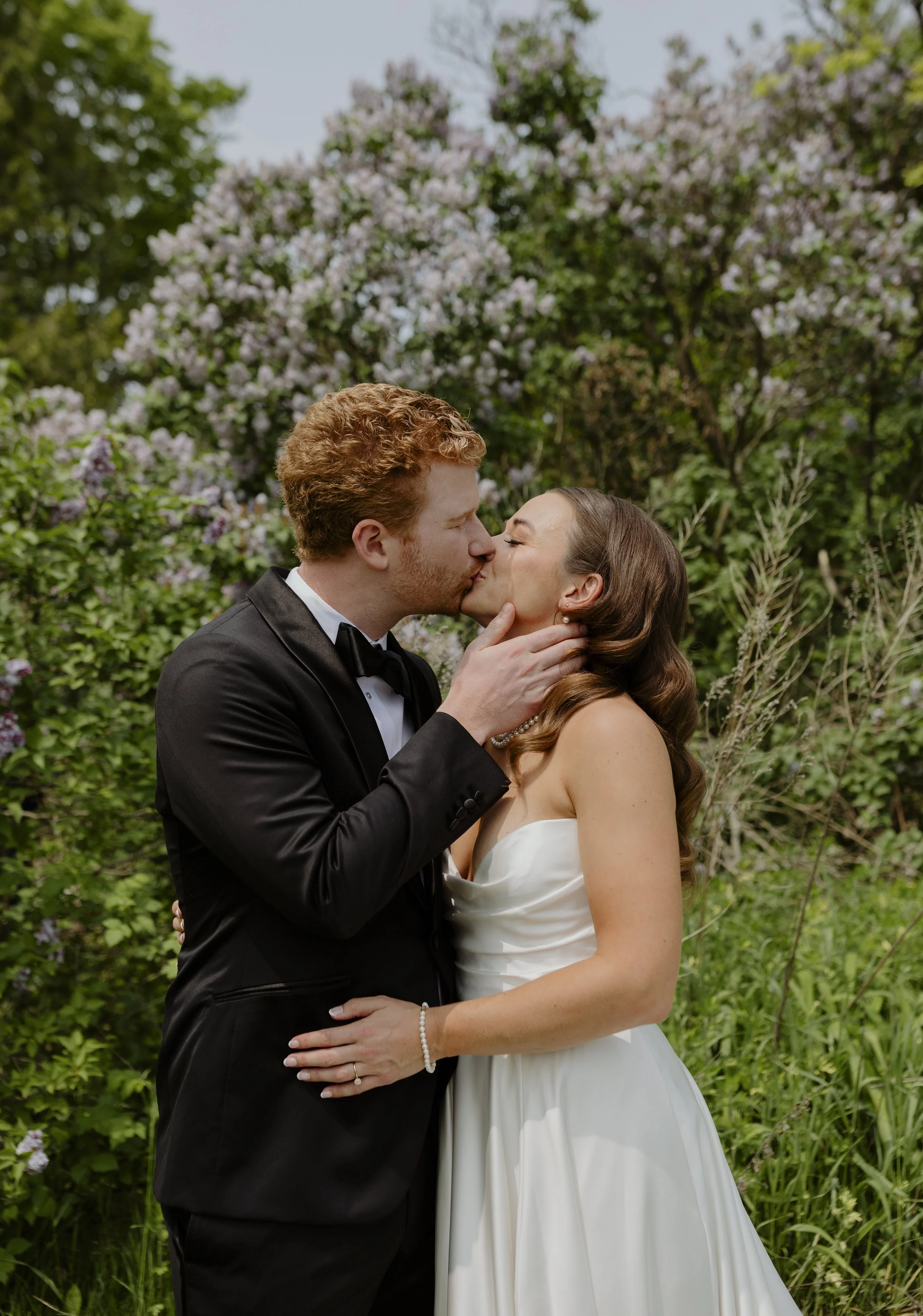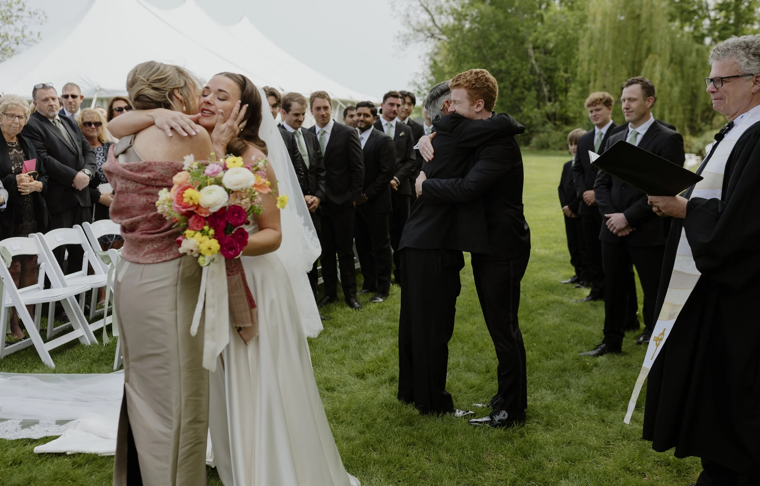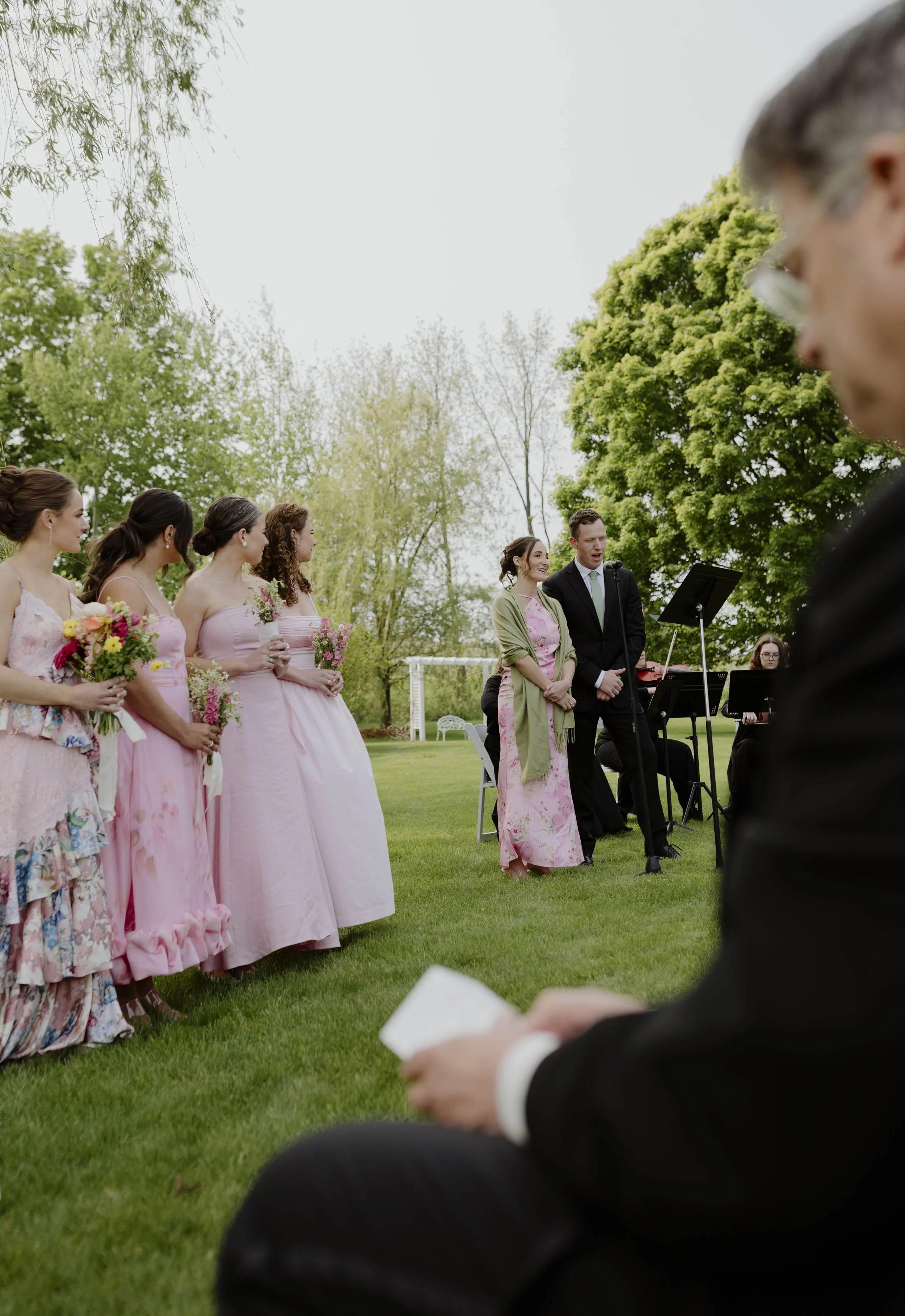 maddy and Brendan shared their first look on the grounds of aurora cellars behind the farmhouse in front of a giant, beautiful, bloomed lilac bush. it made for the most perfect spring backdrop to see each other for the first time on their wedding day. the joy was contagious as they shared excitement, laughter, a few tears, and lots of hugs and kisses. I let them ride the high of the moment while I took a few candid portraits, offering slight posing suggestions only as they looked or asked for them. my main goal is always to keep them present with each other in that special moment. their bridal party joined them in celebration after their first look. we took some relaxed group shots, and after bridal party photos we checked off a handful of family photos before a few more posed, hero portraits of the bride and groom around the grounds of aurora cellars. I always love to grab more documentary, candid shots in between the static, posed family photos or bride and groom portraits. there are always some really intimate, beautiful memories that can go easily missed during these moments of wedding days.