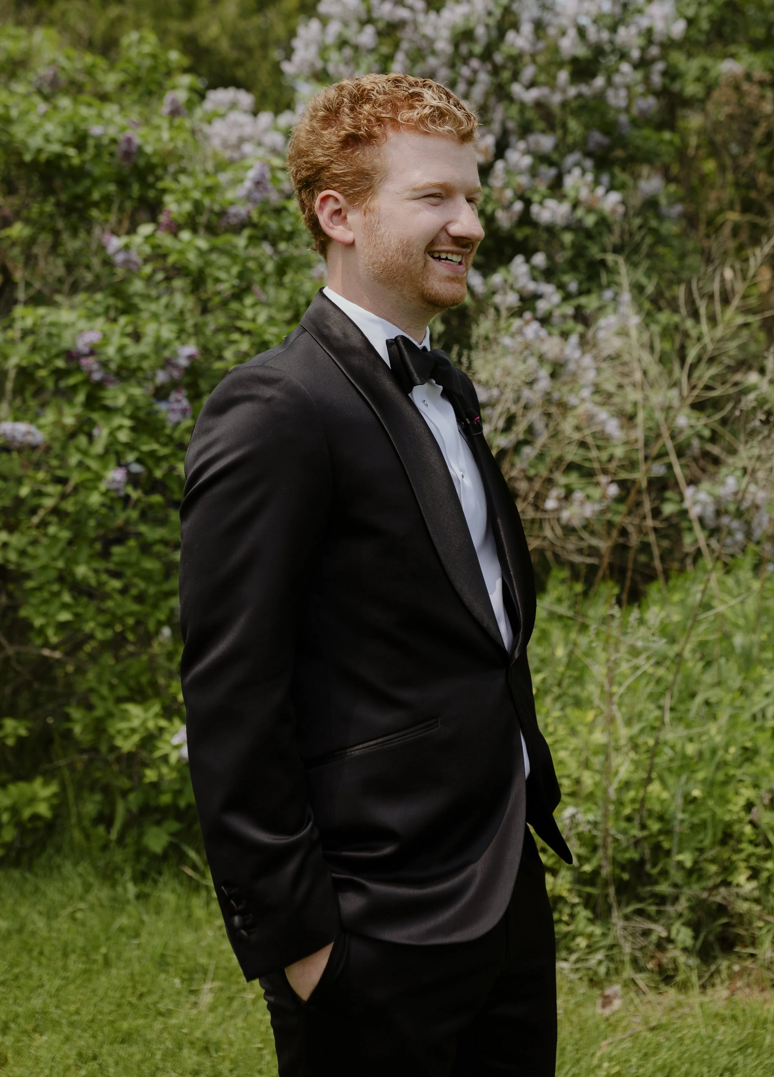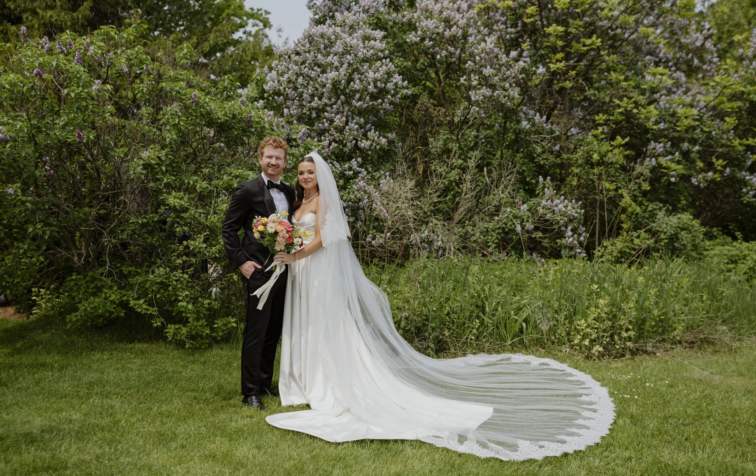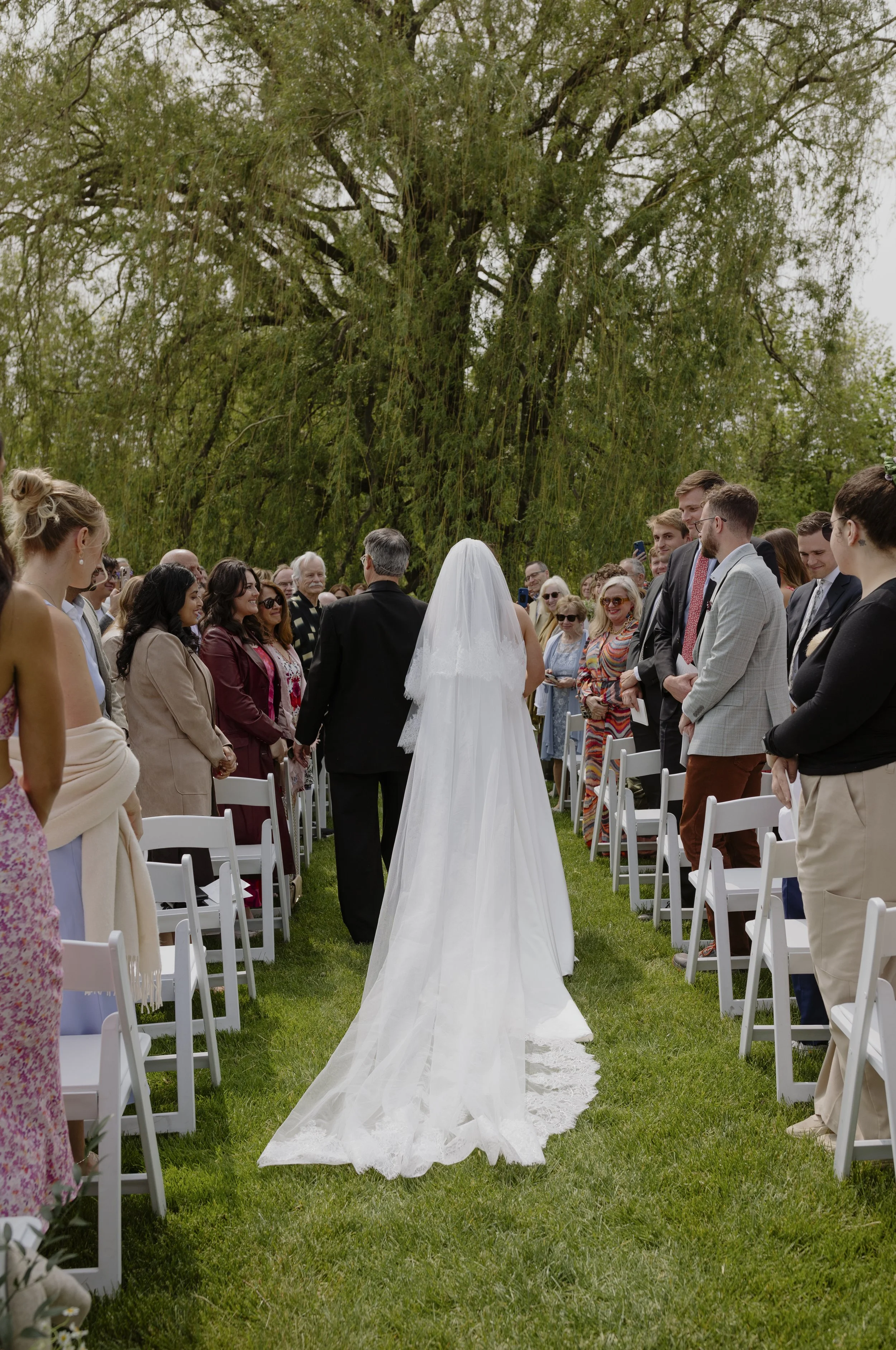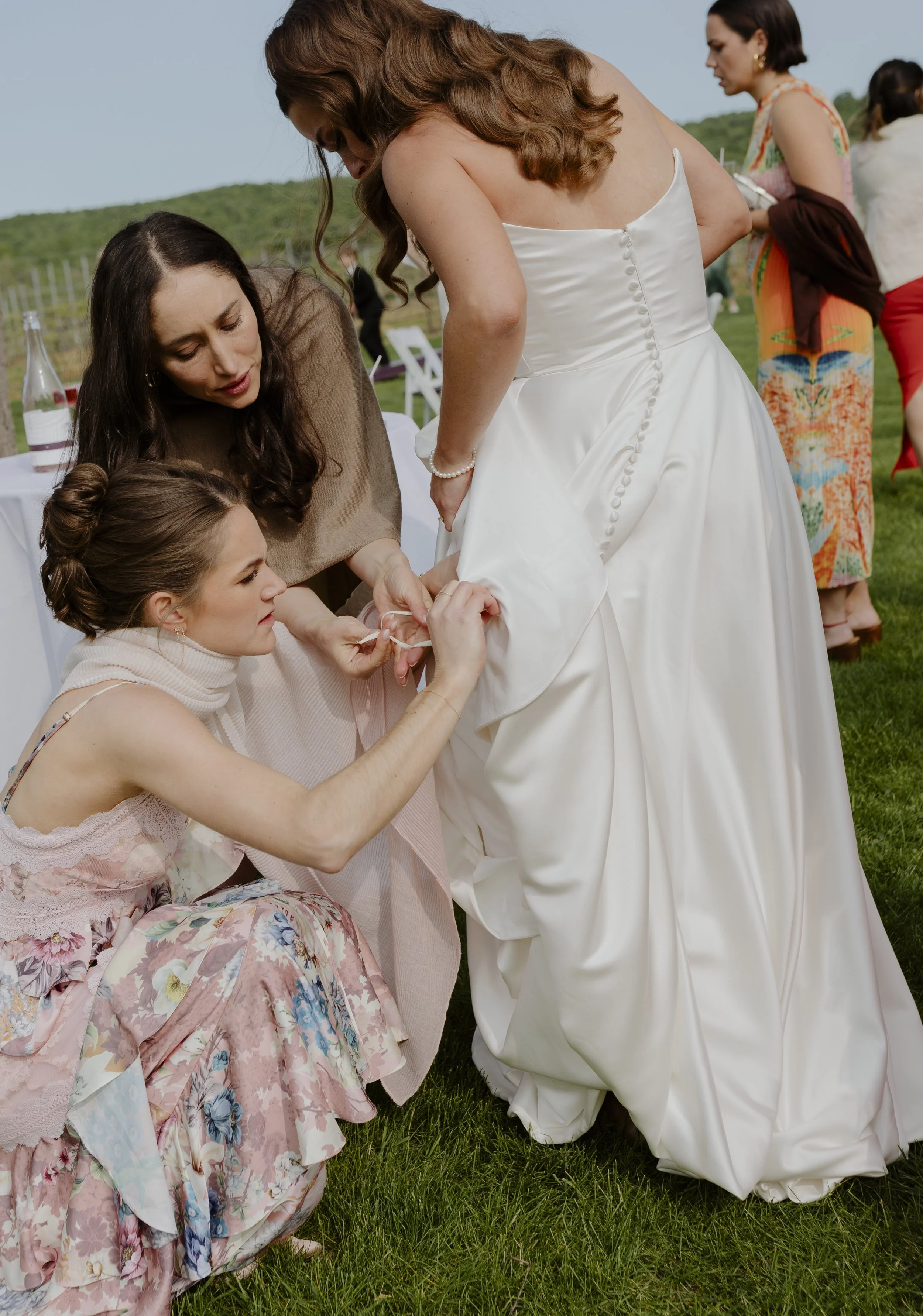 maddy and Brendan shared their first look on the grounds of aurora cellars behind the farmhouse in front of a giant, beautiful, bloomed lilac bush. it made for the most perfect spring backdrop to see each other for the first time on their wedding day. the joy was contagious as they shared excitement, laughter, a few tears, and lots of hugs and kisses. I let them ride the high of the moment while I took a few candid portraits, offering slight posing suggestions only as they looked or asked for them. my main goal is always to keep them present with each other in that special moment. their bridal party joined them in celebration after their first look. we took some relaxed group shots, and after bridal party photos we checked off a handful of family photos before a few more posed, hero portraits of the bride and groom around the grounds of aurora cellars. I always love to grab more documentary, candid shots in between the static, posed family photos or bride and groom portraits. there are always some really intimate, beautiful memories that can go easily missed during these moments of wedding days.