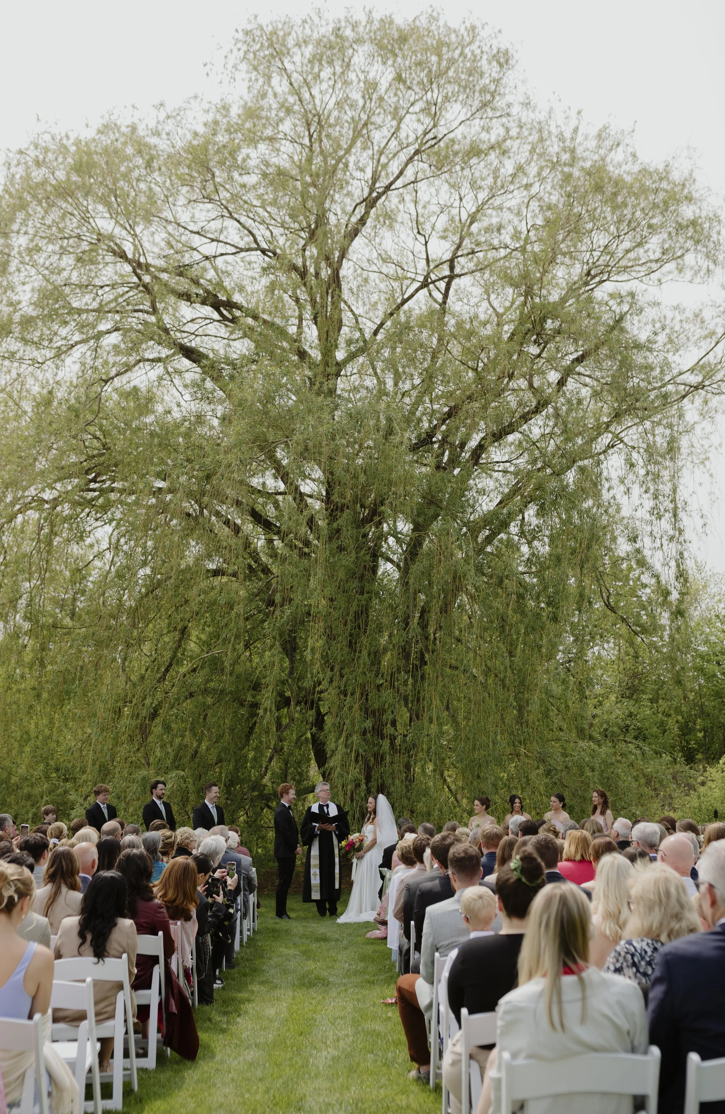 the details and decorations for maddy and Brendan’s wedding day were perfectly simple yet vibrant, accenting the lush greens and vineyard while not distracting from all of the natural beauty surrounding them. the iconic weeping willow was the backdrop for the ceremony, feeling larger than life and perfectly whimsical. their tented reception, courtesy of Tc tented events, provided warmth for the guests once the sun set, and was decorated inside to mimic the greenery and vines of the weeping willow right outside.