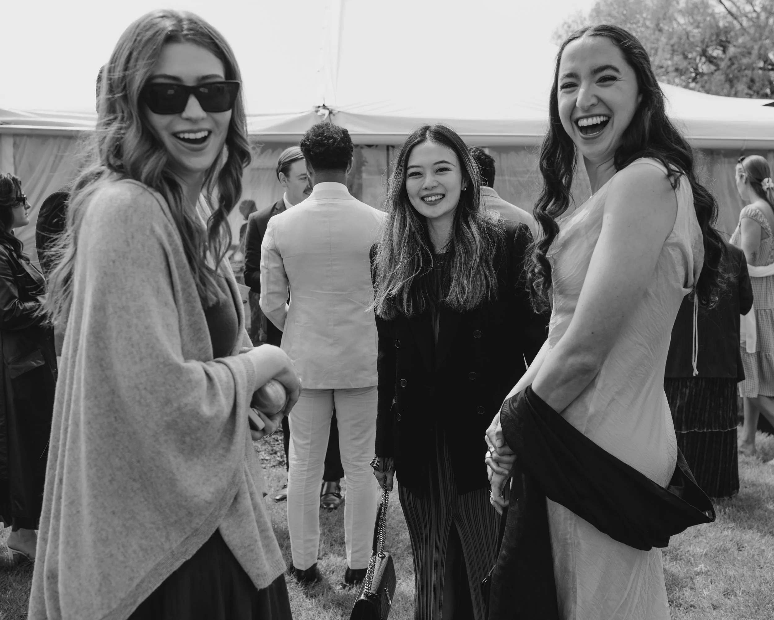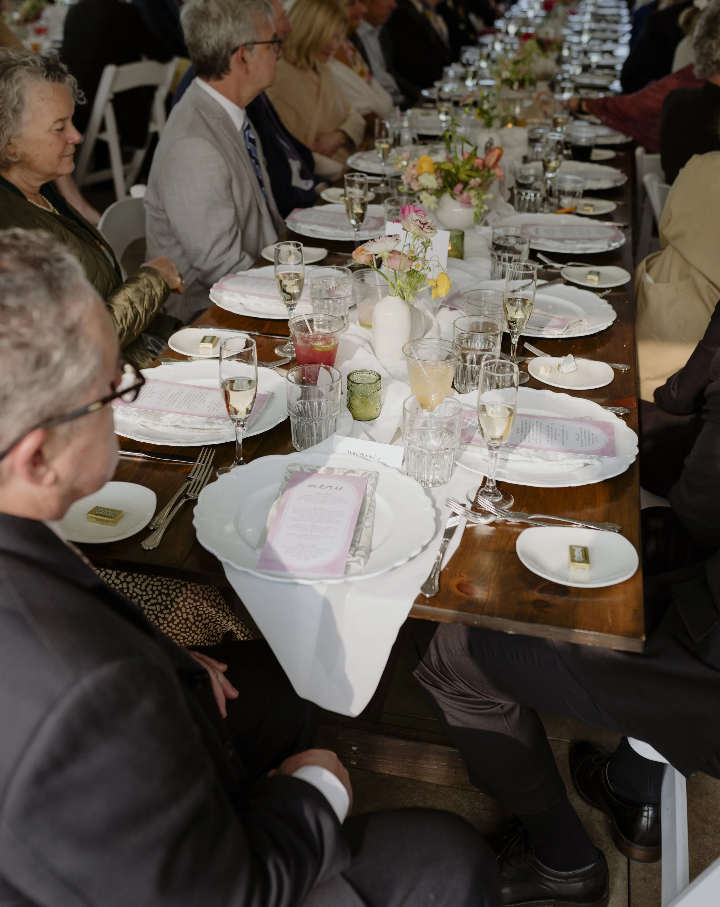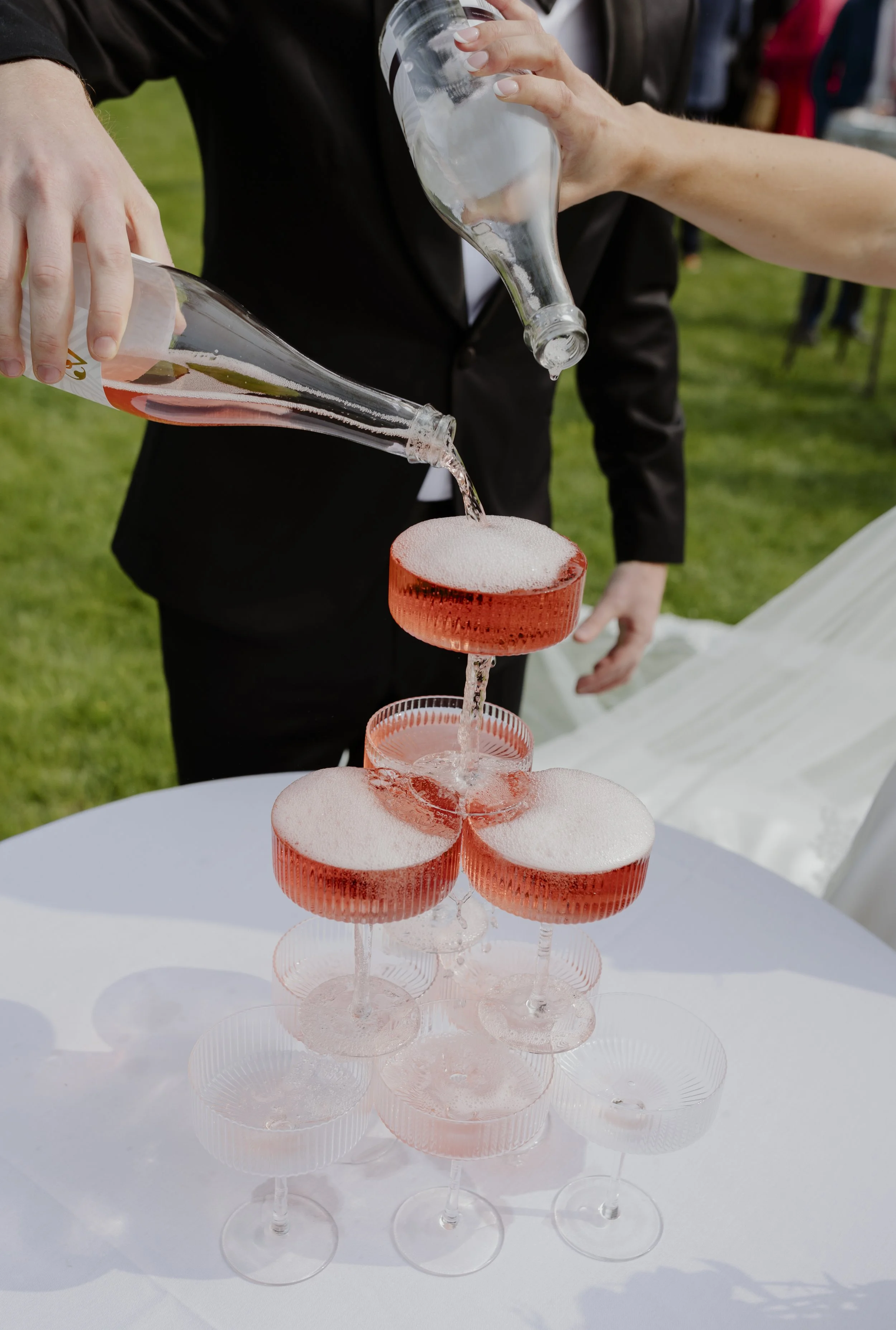 the newlyweds celebrated with each other and their closest people right after the ceremony. they signed their marriage license before joining their guests for a lively, colorful cocktail hour filled with catching up, small talk, and lots of laughs and smiles. they kicked off the night with a champagne tower, pouring aurora cellars own bubbly rose, the pink of the wine matching perfectly with the brides bouquet.